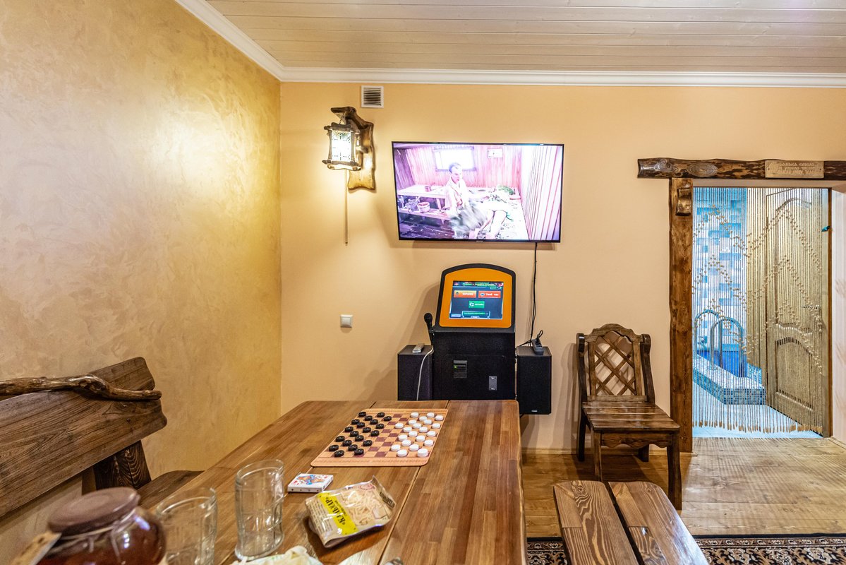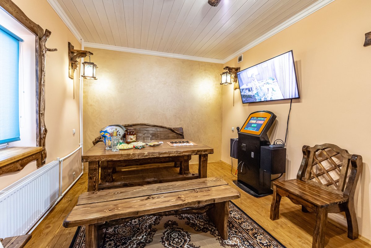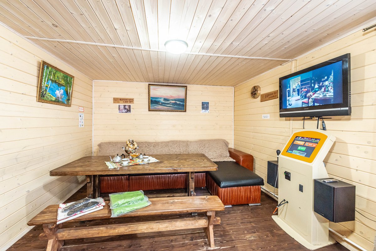 Не хочется в бассейн? Не беда! Вместо этого можно провести время в нашей комнате отдыха. Мы ставили своей целью создать здесь уютный, практичный интерьер из преимущественно натуральных, безопасных материалов, подобрать мебель, которая будет в равной степени удобной и красивой. Надеемся, что вы его оцените! Для поддержания атмосферы отдыха мы можем предложить вам кальян и караоке. Также у нас имеется бар, где вы можете приобрести блюда русской кухни, а при необходимости прийти и со своей едой - мы не возражаем! Главное помните, что плотная трапеза незадолго перед посещением парной - это не самая удачная идея, по мнению врачей. А вот после парной она совсем не повредит!